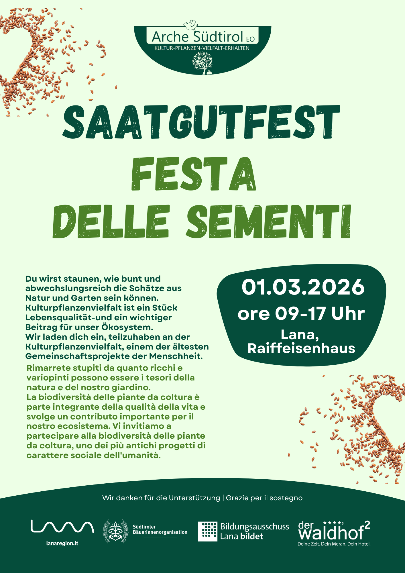 Am Sonntag, 1. März 2026, findet von 9.00 bis 17.00 Uhr im Raiffeisenhaus in Lana das Saatgutfest von Arche Südtirol EO statt. Die Veranstaltung widmet sich der Vielfalt traditioneller Kulturpflanzen und lädt dazu ein, die Schätze aus Garten und Natur neu zu entdecken.