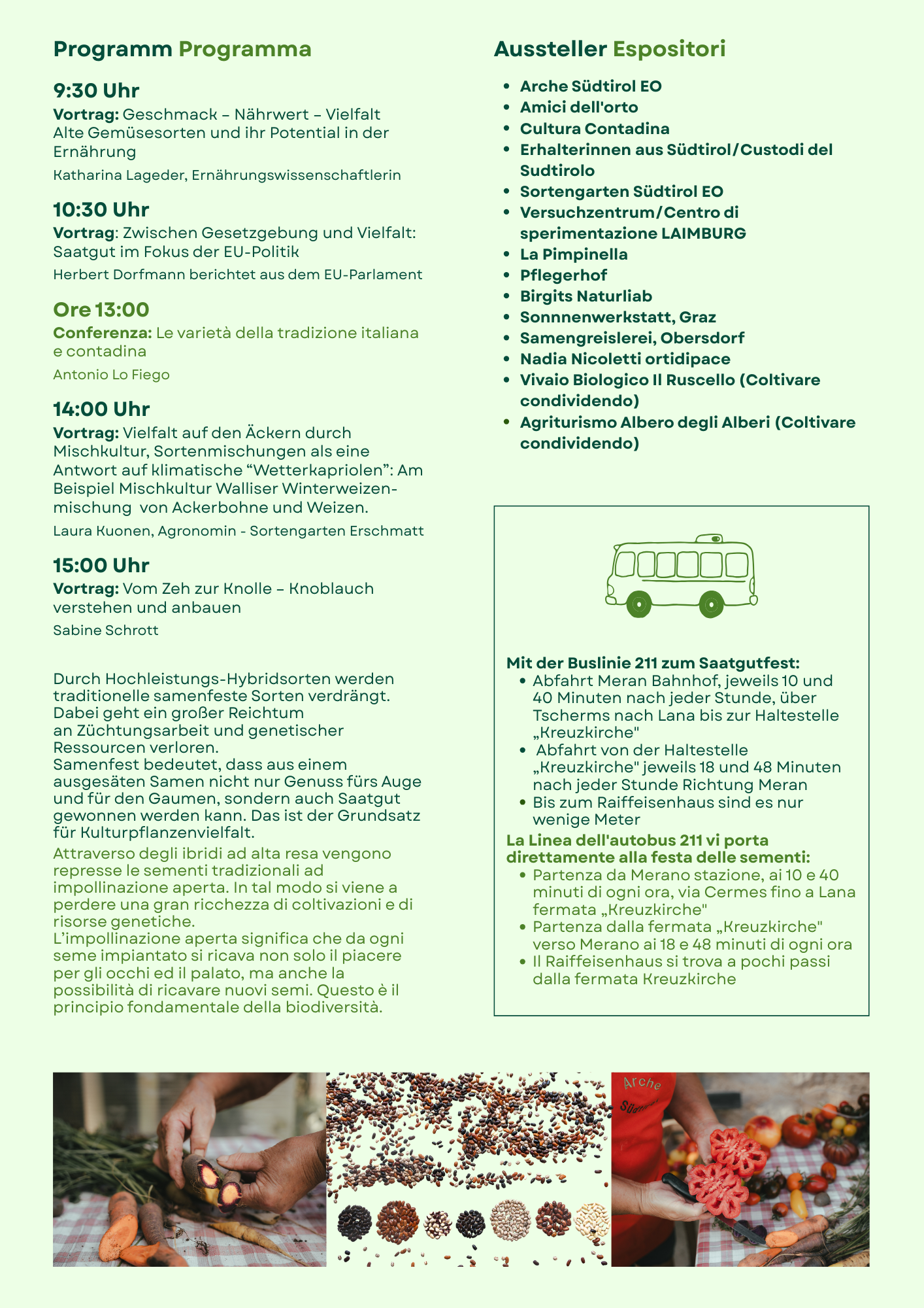 Alte Gemüsesorten und samenfeste Pflanzen stehen im Mittelpunkt und zeigen, wie wichtig Kulturpflanzenvielfalt für Ernährung, Biodiversität und Lebensqualität ist. Fachvorträge beleuchten unter anderem den Wert alter Sorten, aktuelle politische Rahmenbedingungen im Saatgutbereich sowie nachhaltige Anbaumethoden als Antwort auf klimatische Herausforderungen.